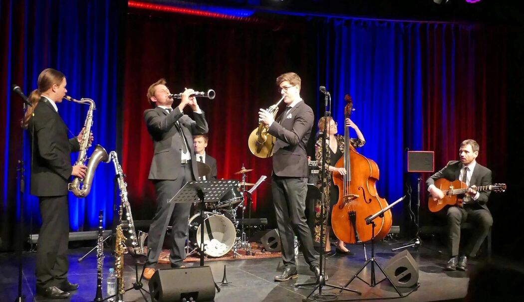Ein Seitenprojekt des Monaco Swing Ensembles also, das Pariser Gypsy-Jazz-Flair mit amerikanischer Swing-Attitüde verband, angeführt von dem Sänger Maximilian Höcherl, der auch das Waldhorn bediente. Begleitet wurde er dabei von Julia Hornung am Kontrabass, Jakob Lakner an der Klarinette, Jan Kiesewetter am Saxophon, Daniel Fischer an der Gitarre sowie Sebastian Wolfgruber am Schlagzeug. Sechs Spitzenmusiker, die mit ihren wuchtigen Bläsersätzen und coolen Swing-Tunes garantiert auch im Savoy Ballroom bestens angekommen wären, dessen einzigartige Atmosphäre Sänger Höcherl in seinen anregenden Ansagen immer wieder in Erinnerung rief.