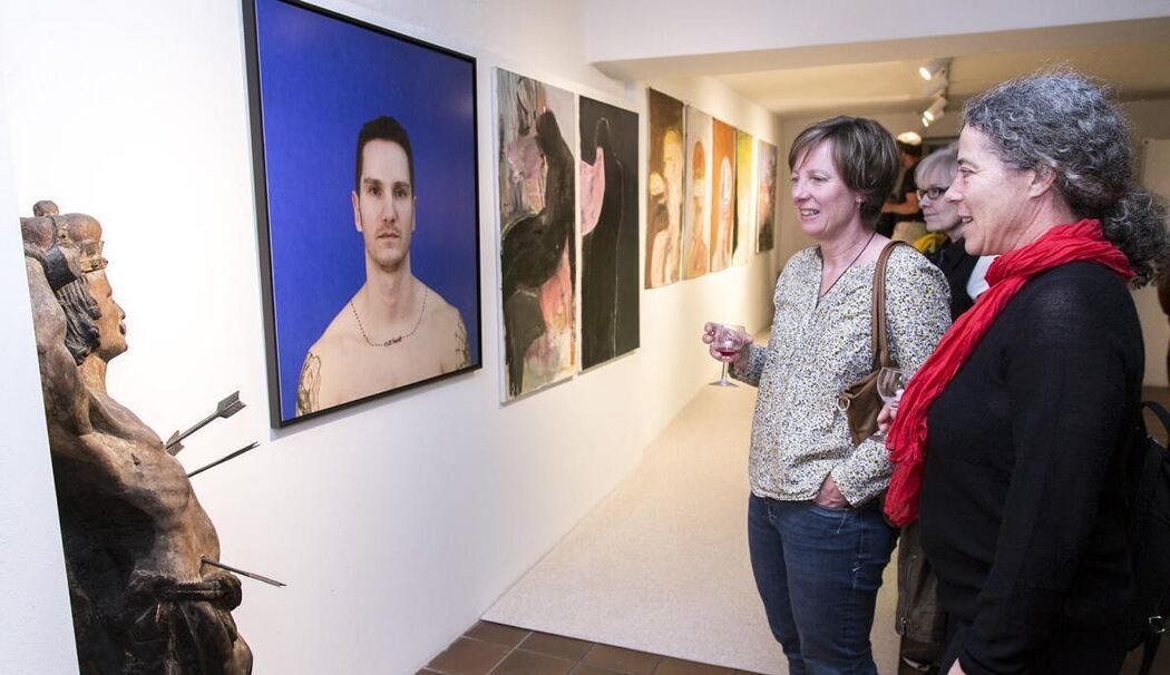 Ausstellungsbesucherinnen vor der Märtyrerstatue des Heiligen Sebastian aus dem Bestand des Spielzeug- und Stadtmuseums (17. Jh.) und einer Fotografie der deutsch-syrischen Künstlerin Adidal Abou-Chamat. (Foto: Effner)