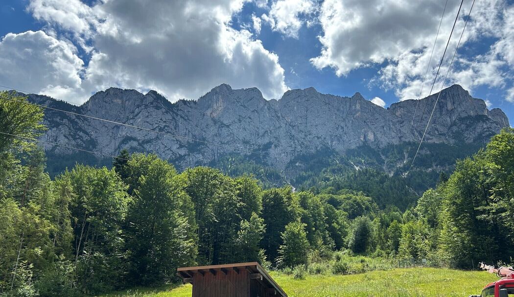 Die Wolken zeichneten ein Spiel von Licht und Schatten auf die mit weiß-blauen Servietten und Latschen bestückten Bierzelttische. Klänge von Tuba, Ziach und Gitarre vertrieben die Stille der Abgeschiedenheit und während die Weißwürste im heißen Wasser zogen, gönnte sich die Hauptprotagonistin eine Verschnaufpause: Ihre Kabinen standen geparkt am Rand des Geschehens beziehungsweise in Startposition, die Seile schwebten frei von jeglicher Last dem Massiv zu, bis sie sich weit oben beim winzigen Häuschen in einer Kerbe des Gebirgskamms wiedertrafen.