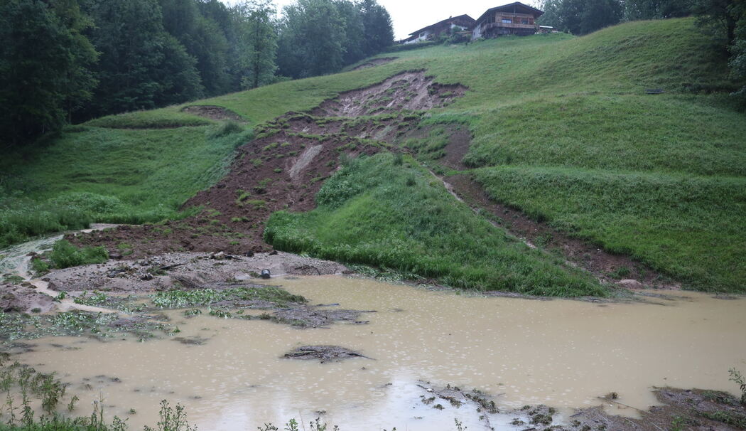 Überflutete Straßen, Erdrutsche, evakuierte Häuser und möglicherweise zwei Todesopfer - nach starkem Regen hat der Landkreis Berchtesgadener Land am späten Samstagabend den Katastrophenfall ausgerufen. Zwei Menschen starben in dem Hochwassergebiet. Landrat Bernhard Kern gab bekannt, dass ein Opfer an einer natürlichen Todesursache verstorben sei, die jedoch auch mit dem Unwetter zusammenhängen könne.
