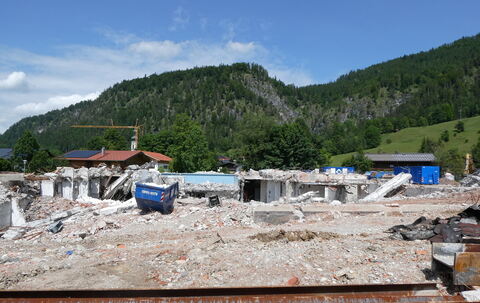 Für das Gewerk »Fliesenlegerarbeiten« wurden zwei Nachträge an die Firma Huber & Huber aus Kössen vergeben. Hierbei handelt es sich zum einen um eine Naturstein-Trennmauer im Bereich der Außenanlage und zum anderen um eine teilweise Verkleidung der Außenwände der Tourist-Info mit Natursteinen.