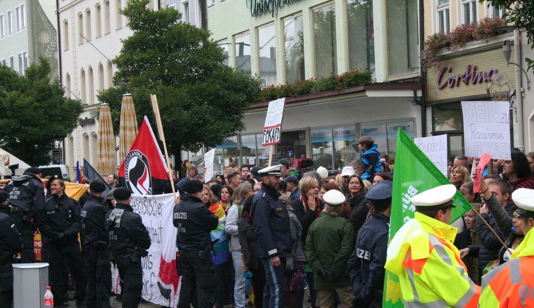 Auf dem Maxplatz war zeitgleich eine Gegenversammlung eines breiten Bündnisses (u.a. Friedensinitiative Traunstein-Trostberg-Traunreut und Bündnis 90 / Die Grünen) angemeldet.