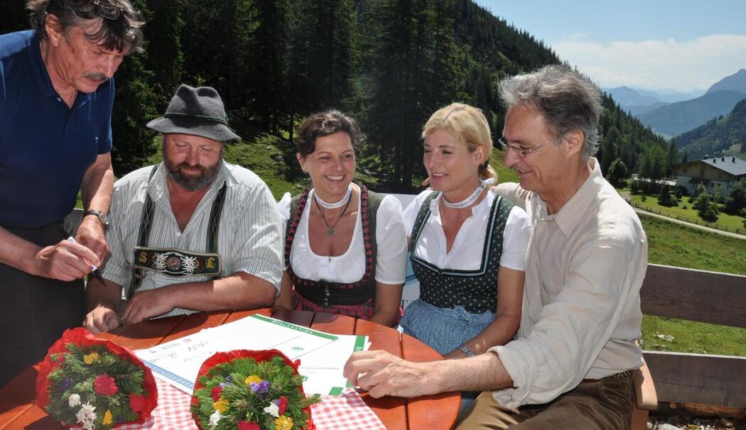 DAV-Vizepräsident Rudi Erlacher (von links), Schlechings Bürgermeister Josef Loferer, Wirtschaftsministerin Ilse Aigner, Umweltministerin Ulrike Scharf und Sachrangs Bürgermeister Peter Solnar bei der Unterzeichnung der Urkunde. (Foto: Wunderlich)