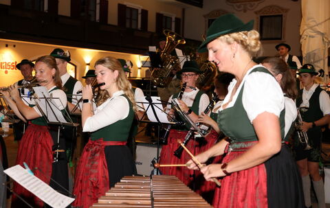 Um 20 Uhr kam noch einmal richtig Stimmung auf, als die Blaskapelle Maria Gern« am Weihnachtsschützenplatz ihr Standkonzert mit dem Marsch »Berglandkinder« eröffnete. Der musikalische Leiter Franz Kurz begrüßte im Namen der Marktgemeinde Berchtesgaden und der Kapelle alle Gäste im Ortszentrum zum letzten »Montag auf'd Nacht werd Musi g'macht«.